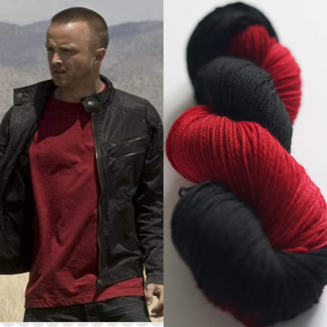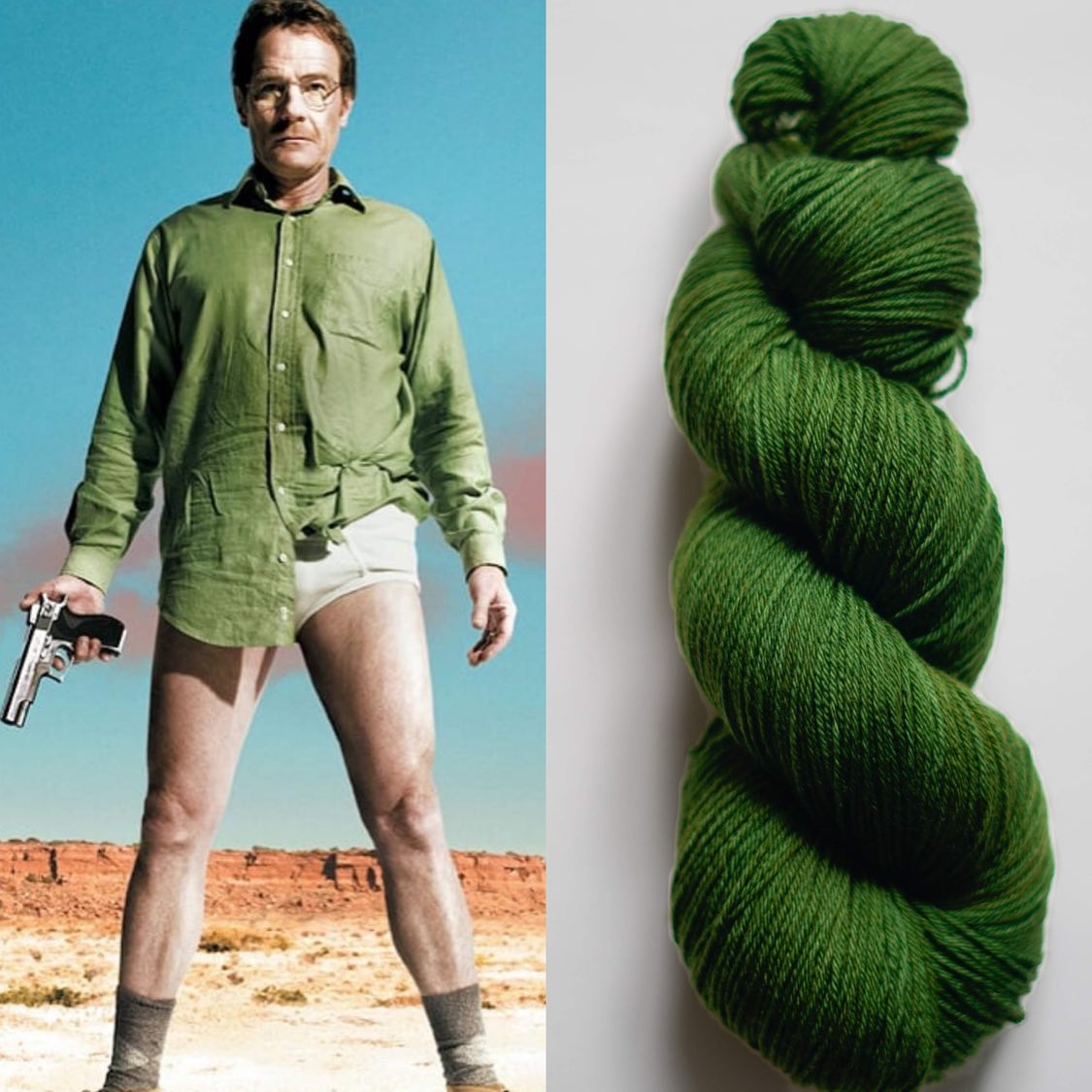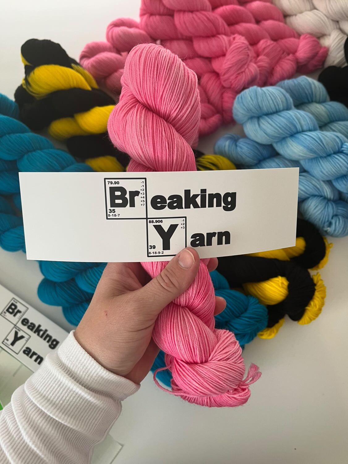 Her yarn’s vibrant colorways are named after the show’s characters, memorable props, and fictional entitiesWalter White, Jesse Pinkman, Pink Teddy Bear, Lily of the Valley, Gray Matter, and Golden Moth, among others.